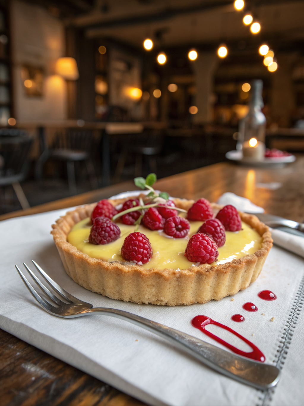 Sharp coastal berries on a shortcrust base with burnt meringue and aromatic pine needle oil.