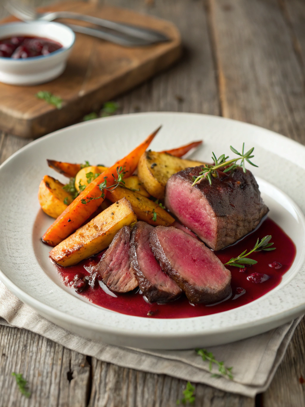 Roasted loin with salt-baked celeriac, pickled chanterelles, and a concentrated game jus.