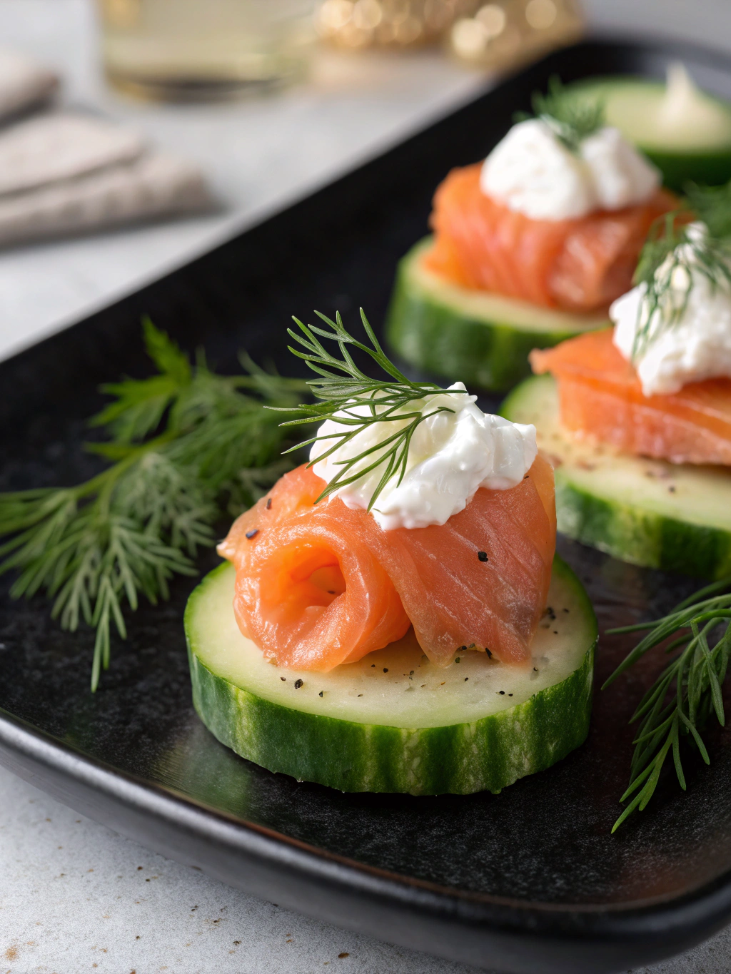 Juniper-cured salmon with cucumber ribbons, dill emulsion, and fresh horseradish snow.